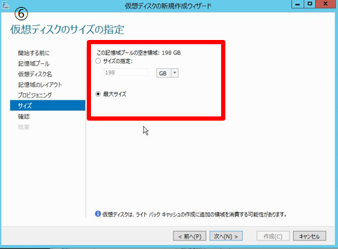 - 6. 仮想ディスクのサイズの指定を行う。