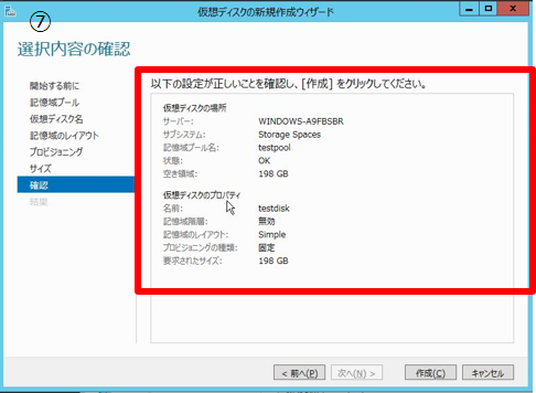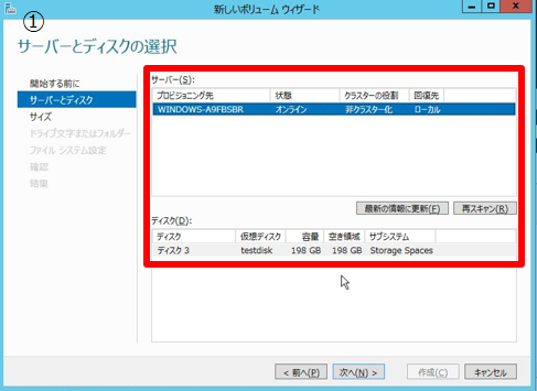 記憶域プールを作成したので作成した記憶域プール上に仮想ディスクを作成し、その仮想ディスク上に通常と同様にボリュームを作成します。