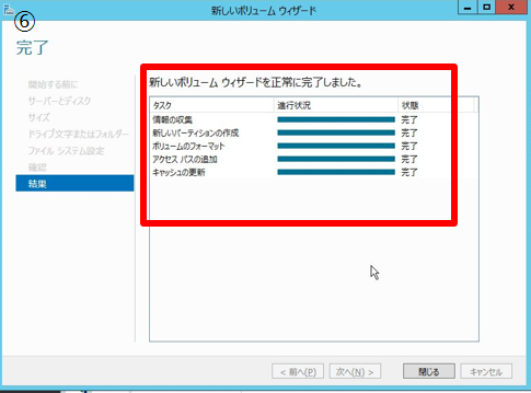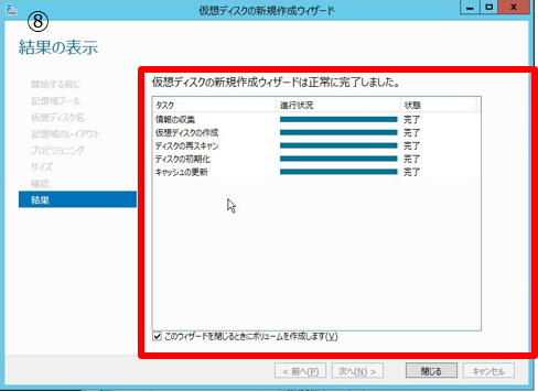 - 8. 作成結果を確認する。「このウィザードを閉じるときにボリュームを作成します」にチェックする。