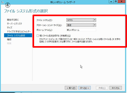 - 4. ファイルシステム形式の選択を行う。