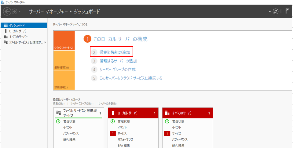 ① サーバーマネージャーで「役割と機能の追加」をクリックします。