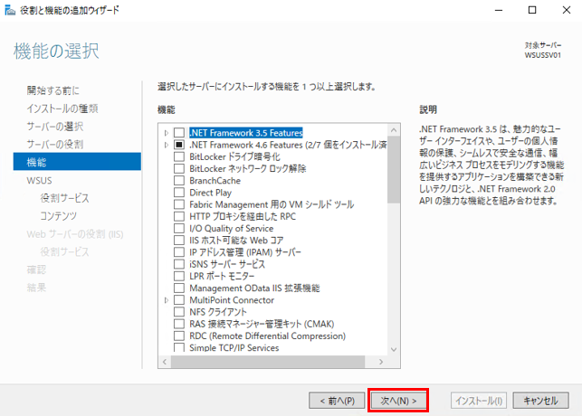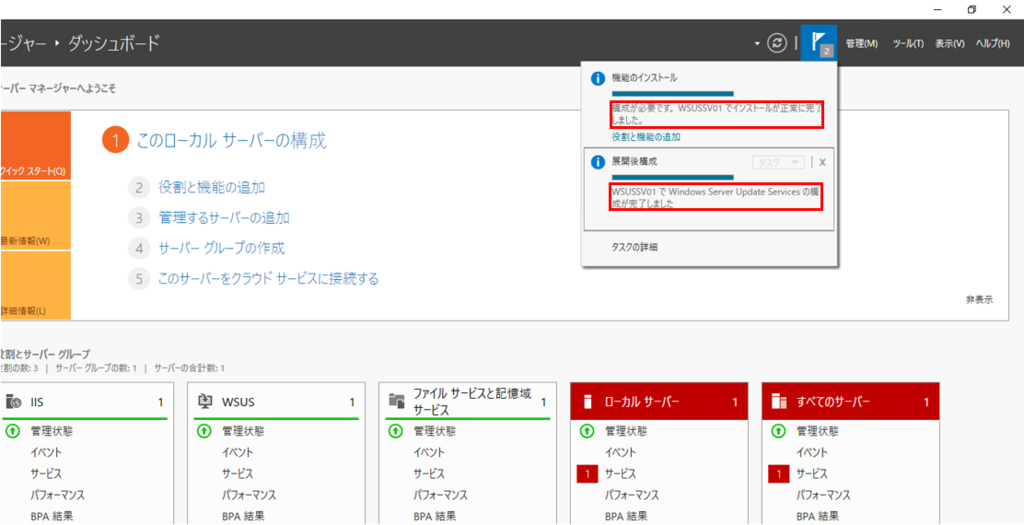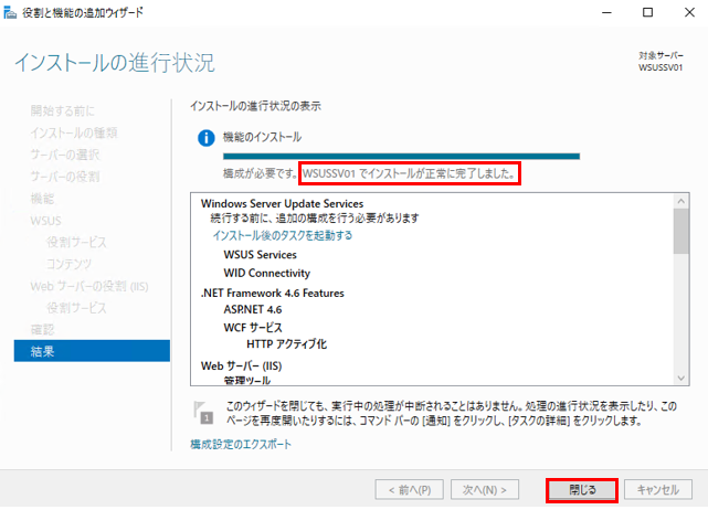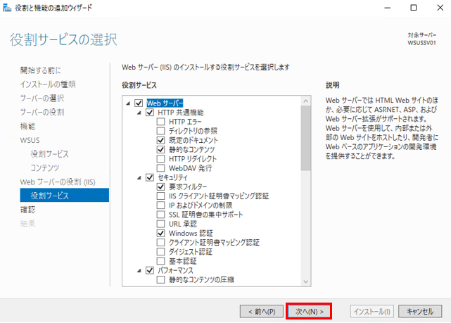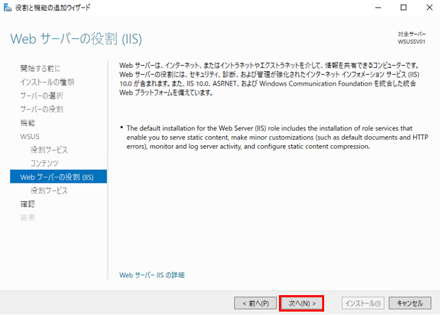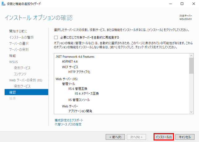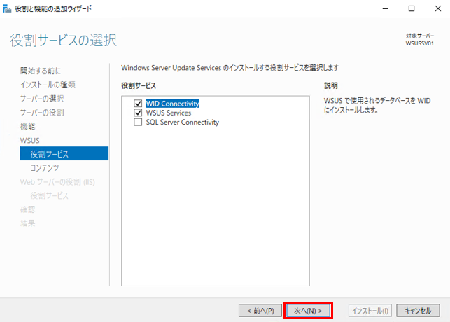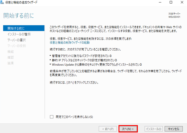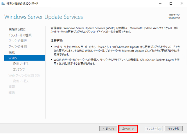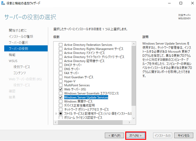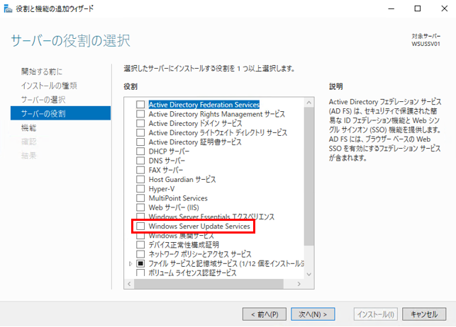 前述と同じ手順で「役割と機能の追加」からWSUSをインストールします。