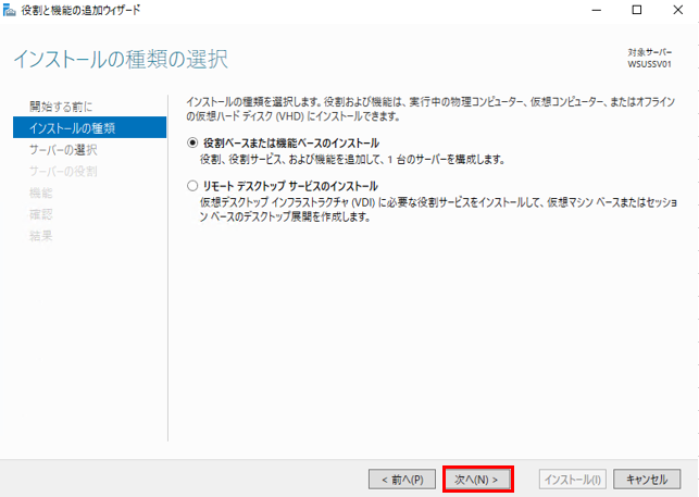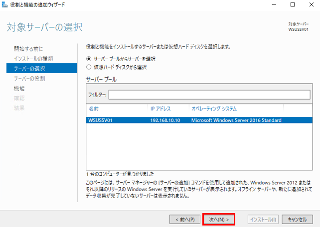 ④ 対象サーバーが選択されている状態で「次へ」をクリックします。