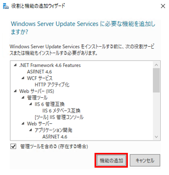 ⑥ WSUS に必要な追加機能が表示されるため、「機能の追加」をクリックします。