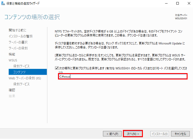 ⑪ パスには今回は「C:\wsus」と入力し、「次へ」をクリックします。