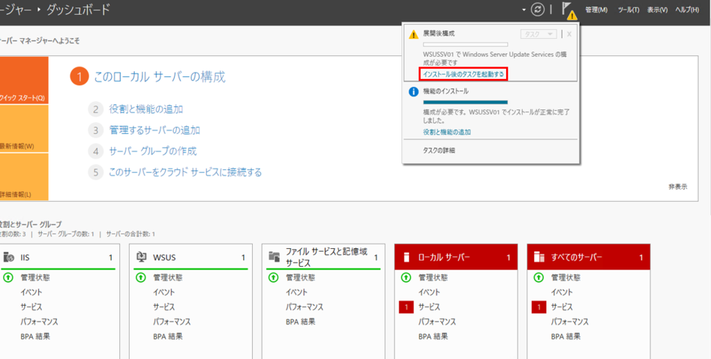⑯ サーバーマネージャー画面に戻り、「インストール後のタスクを起動する」をクリックします。