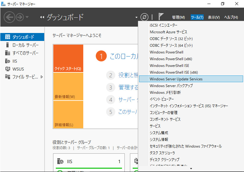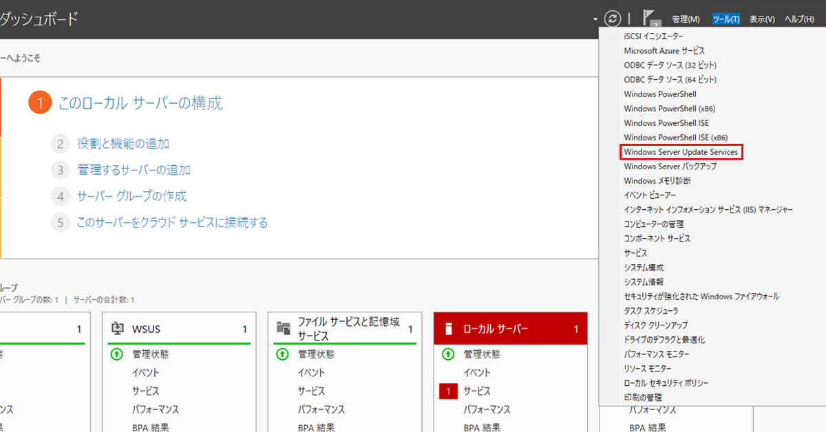 ① サーバーマネージャーで「ツール」の「Windows Server Update Services」をクリックします。