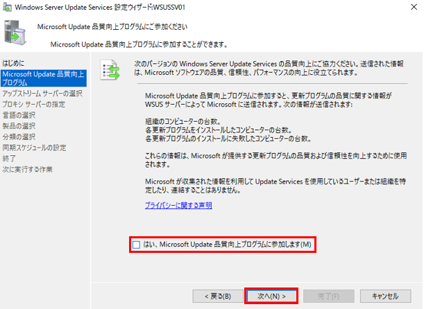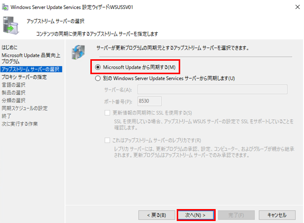 続いてWSUSの設定も前述の通りに設定していき、以下の「アップストリームサーバーの選択」画面からダウンストリームサーバーとしての設定をします。