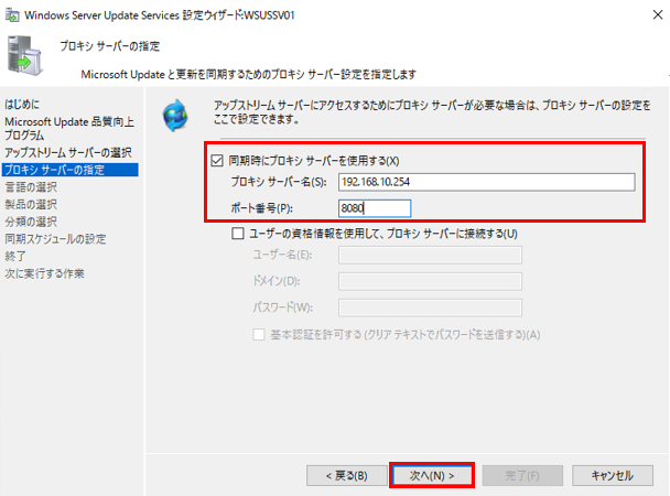 ⑤ プロキシサーバの設定として、ルーターのプライベートIPとWebプロキシの受け側ポートを設定し、「次へ」をクリックします。