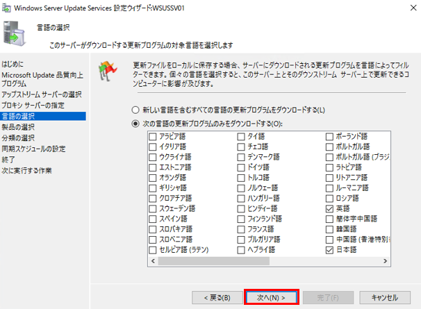 ⑧ 任意の言語をチェックし、「次へ」をクリックします。