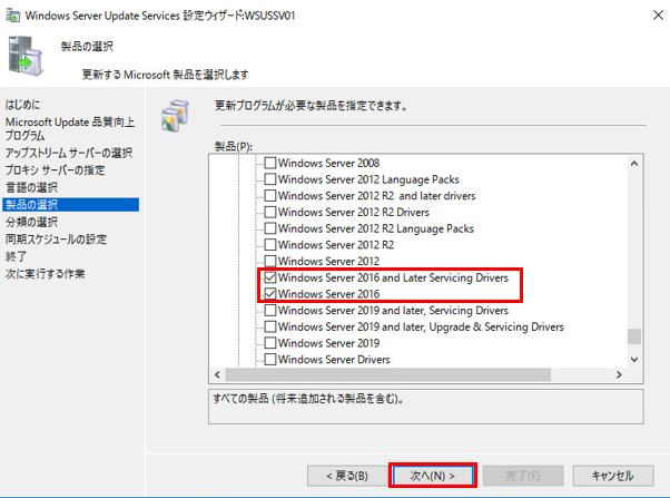 ⑨ 対象の製品をチェックします。今回は「Windows Server 2016」および「Windows Server 2016 and Later Servicing Drivers」をチェックし、「次へ」をクリックします。