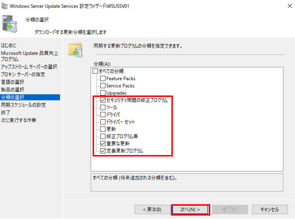 ⑩ 対象とする更新プログラムの分類を選択し、「次へ」をクリックします。