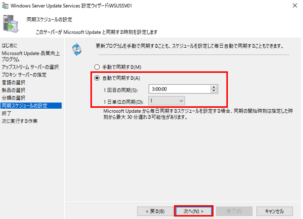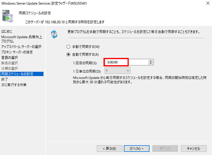 ②同期スケジュールの設定画面の「1回目の同期」は、WSUSSV01作成時の値を入力します。