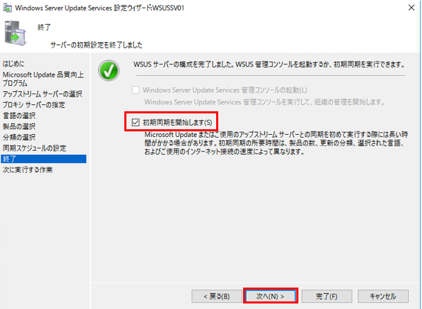 ⑫ 「初期同期を開始します」にチェックし、「次へ」をクリックします。