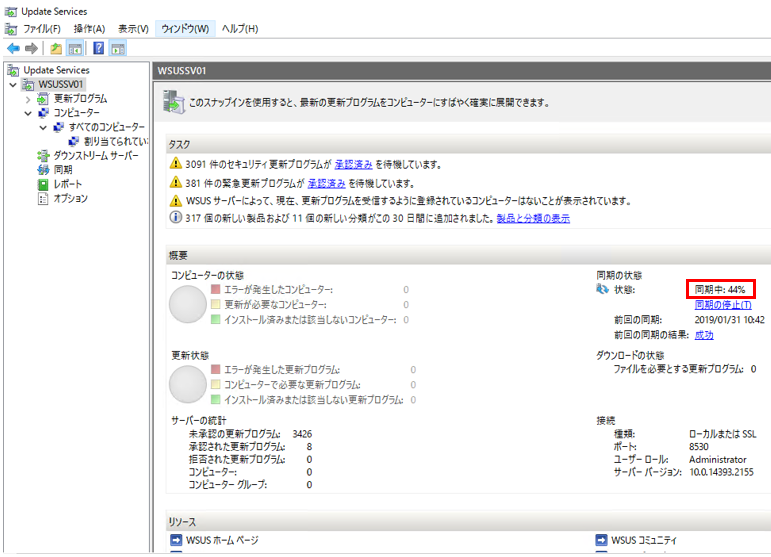 ⑭ WSUSを起動し、同期が開始されたことを確認します。