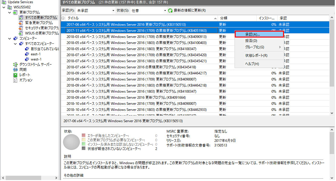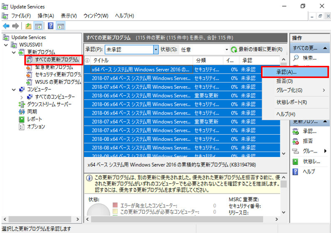 ⑥「WSUSSV02」-「更新プログラム」-「すべての更新プログラム」から対象の更新プログラムを選択し、「右クリック」-「承認」をクリックします 。