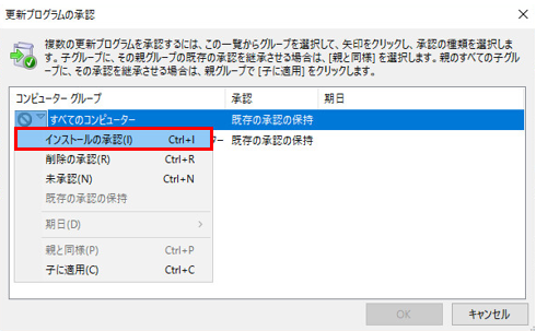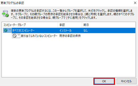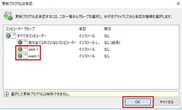 ⑦「更新プログラムの承認」から対象のサーバーを選択して「OK」をクリックします。