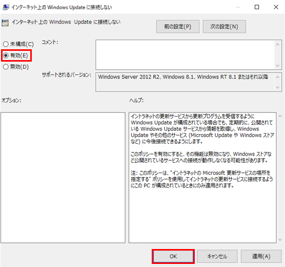 ②「インターネット上のWindows Updateに接続しない」設定を「有効」を選択し、「OK」をクリックします。