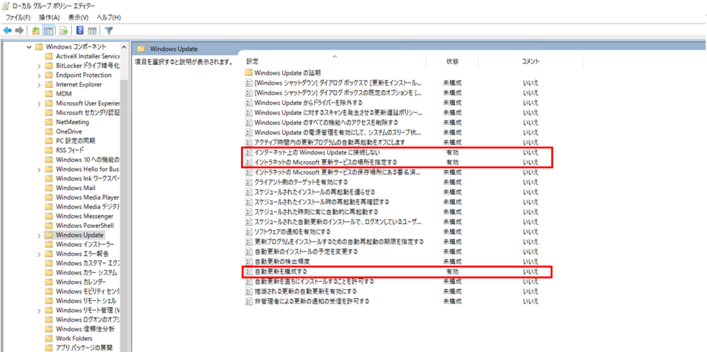 前述と同じ手順でグループポリシーの設定と自サーバーを対象にWindows Updateを実施します。