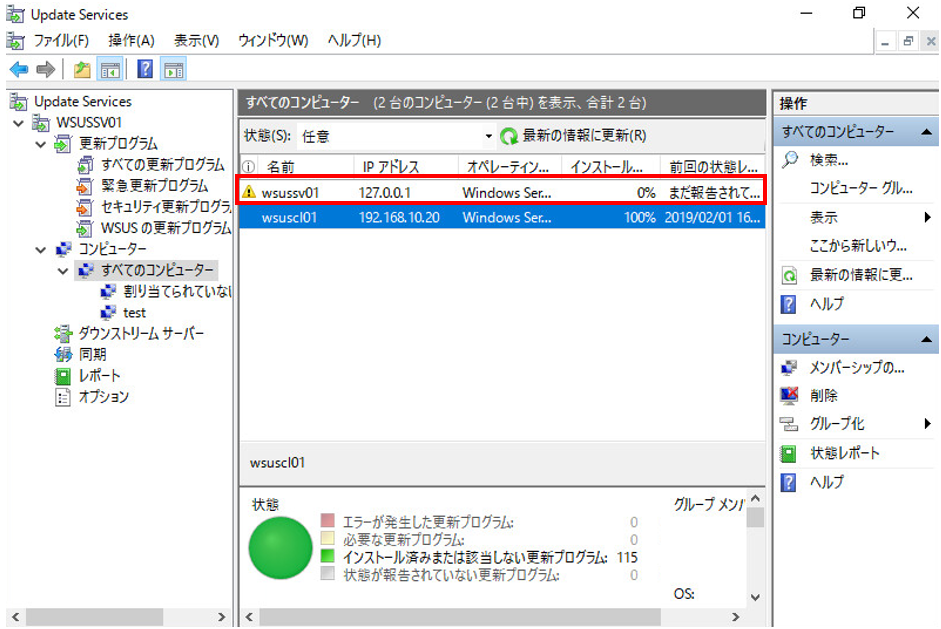自サーバー(WSUSサーバー(ダウンストリーム))が登録されていることを確認します。