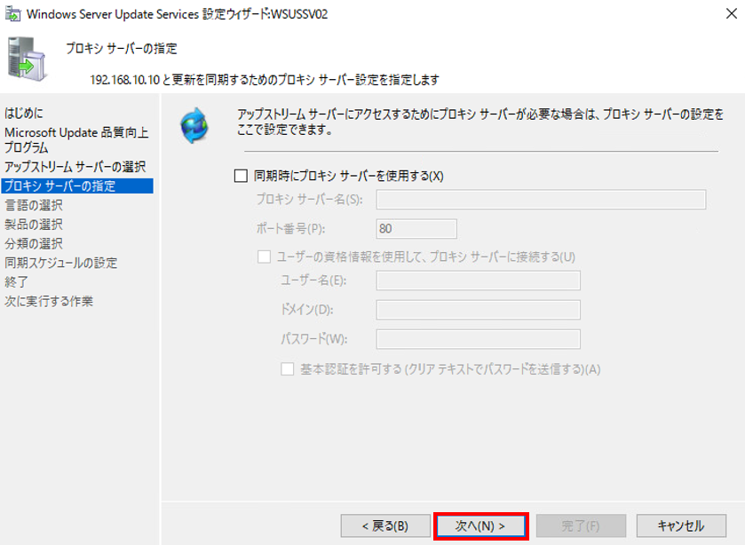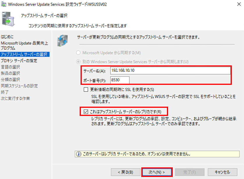 ①アップストリームサーバーの選択画面では、サーバー名にWSUSSV02のIPアドレスを入力します。