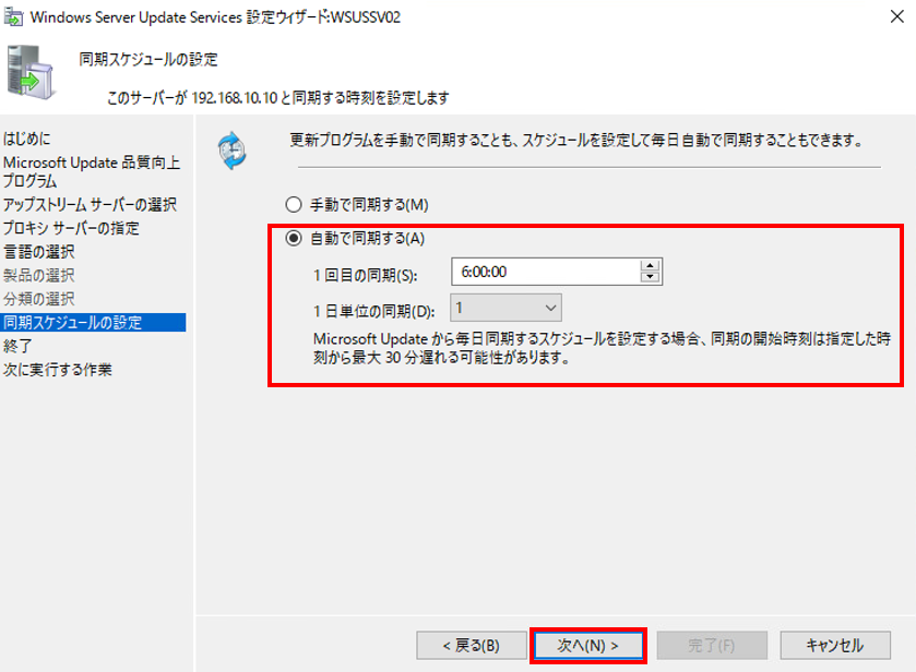 ⑪ 更新プログラムを同期する時刻と周期を選択し、「次へ」をクリックします。