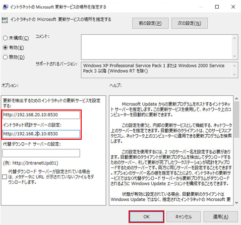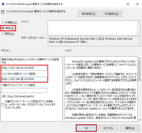 ①「イントラネットのMicrosoft更新サービスの場所を指定する」設定を「有効」にし、画面赤枠2箇所に「http://192.168.20.10:8530」を指定し、「OK」をクリックします。