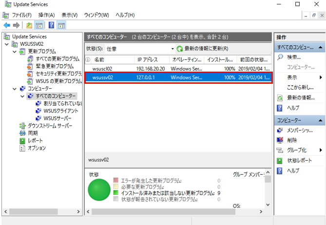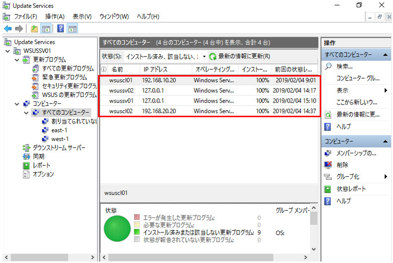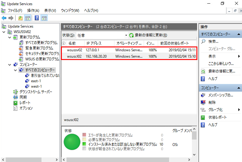 WSUSサーバー(アップストリーム)の「Update Services」画面には全4台、WSUSサーバー(ダウンストリーム)の「Update Services」画面には全2台の管理対象コンピュータが表示されていることを確認します。