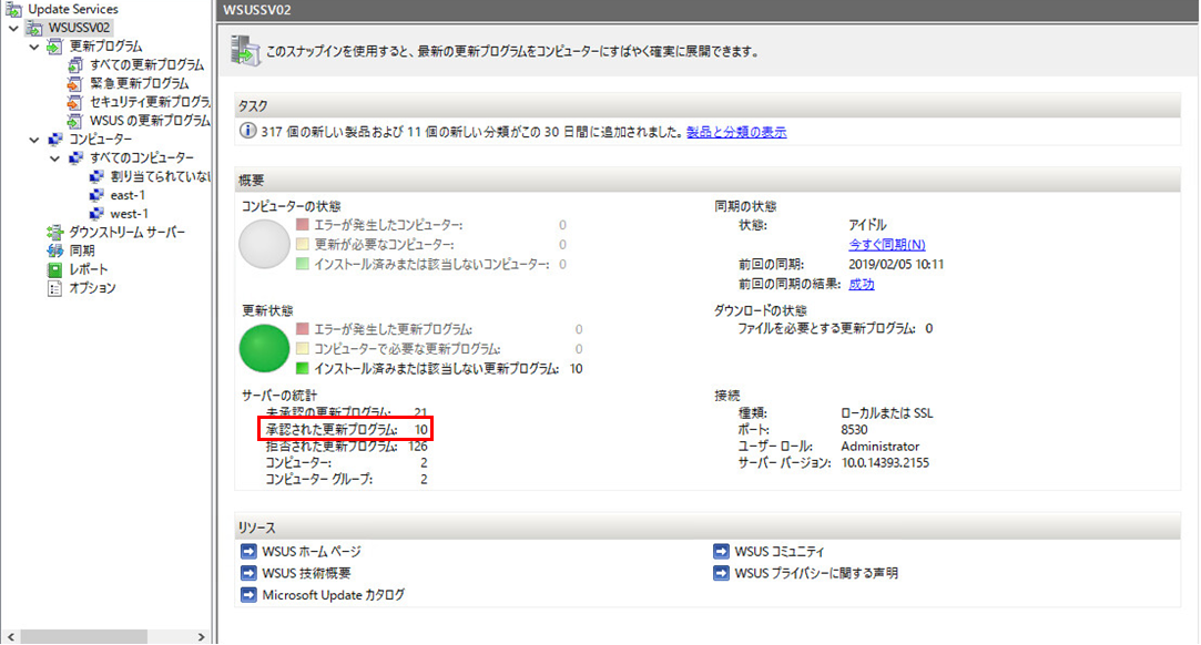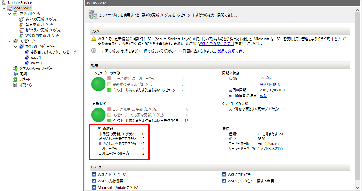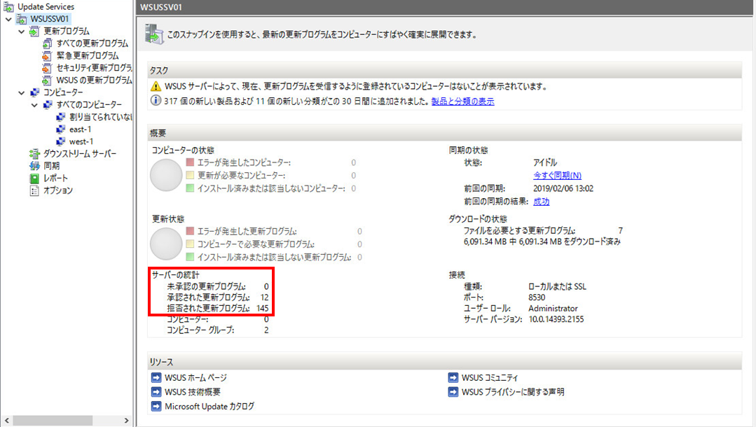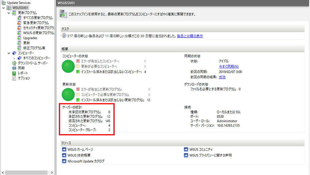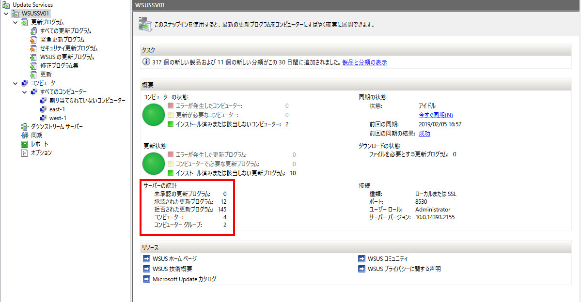 WSUSSV02(ダウンストリーム)と同期後、WSUSSV01(アップストリーム)のサーバーの統計情報が、障害発生前の状態と一致していることを確認します。