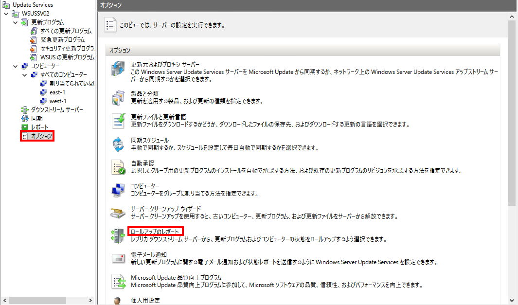 ・「オプション」-「ロールアップのレポート」-「レプリカダウンストリームサーバーから状態をロールアップする」を選択し、「OK」をクリックします。