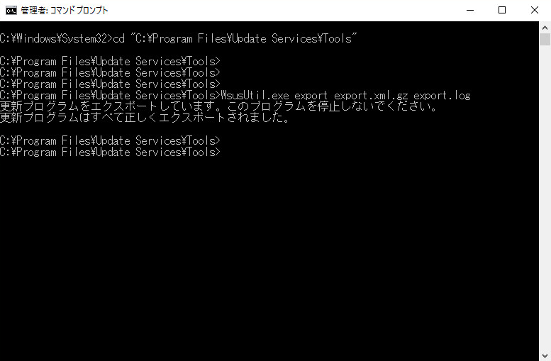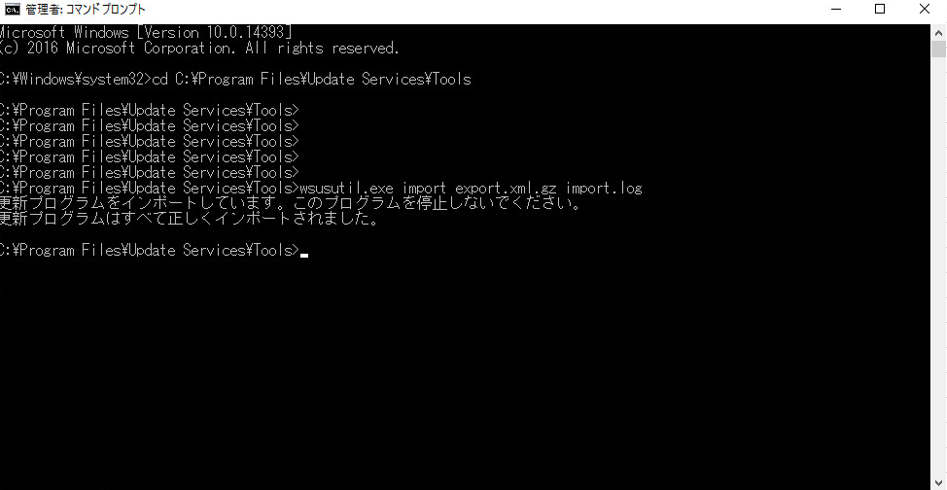 ③管理者権限でコマンドプロンプトを起動し、適切なディレクトリに移動後、下記コマンドを実行しカタログのメタデータ (更新プログラムのリスト) をインポートします。