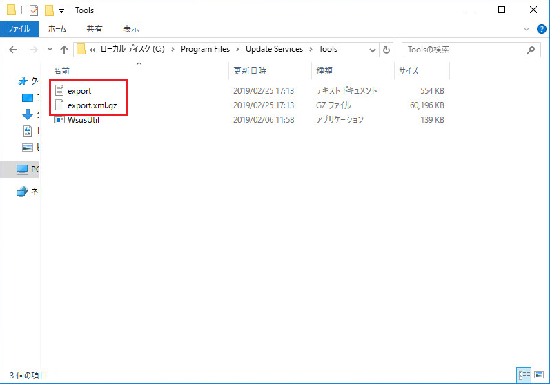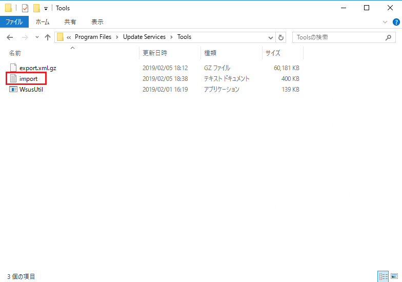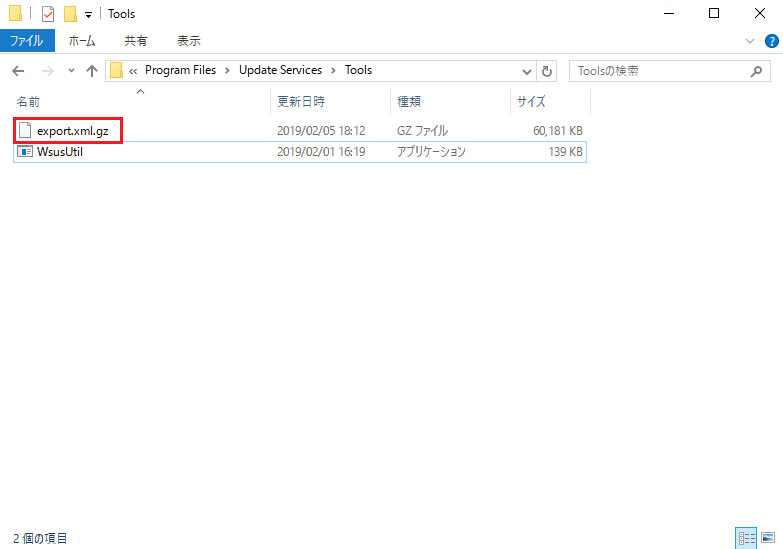②「更新プログラムのエクスポート」- ③でコピーした「export.xml.gz」(メタデータ)を「C:\Program Files\Update Services\Tools」フォルダ配下へ配置します。