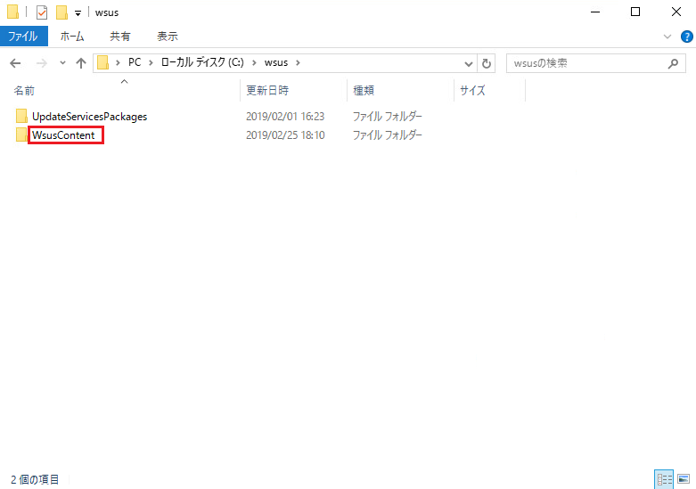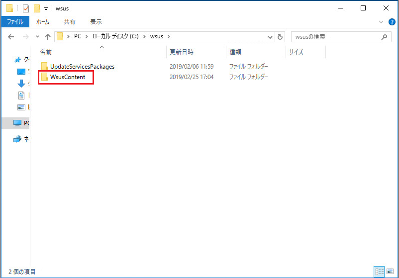 ・1.)WSUSサーバー(アップストリーム)の構築 - ⑪ で設定したディレクトリにある 「WSUSContents」フォルダ(更新ファイル)