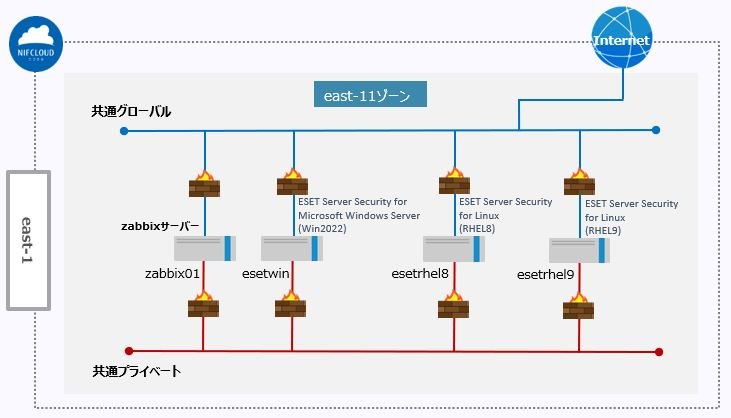 今回の検証ではZabbix serverをインストールしたサーバーを1台と、それぞれ異なるOS(Windows Server 2022、Red Hat Enterprise Linux 8.7、Red Hat Enterprise Linux 9.1)にESETをインストールしたサーバーを3台用意します。