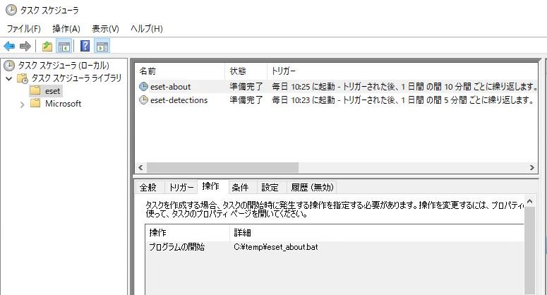 以下の例では eset_about.bat を10分ごと、eset_detections.bat を5分ごとに実行するようにしています。