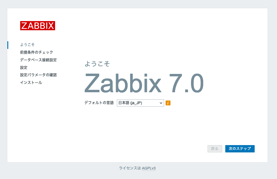 これでサーバーのインストールは完了です。Webブラウザーから「http://サーバーのIPアドレス/zabbix」にアクセスしてみましょう。Zabbixのセットアップ画面が表示されます。指示に従い、セットアップを完了させてください。