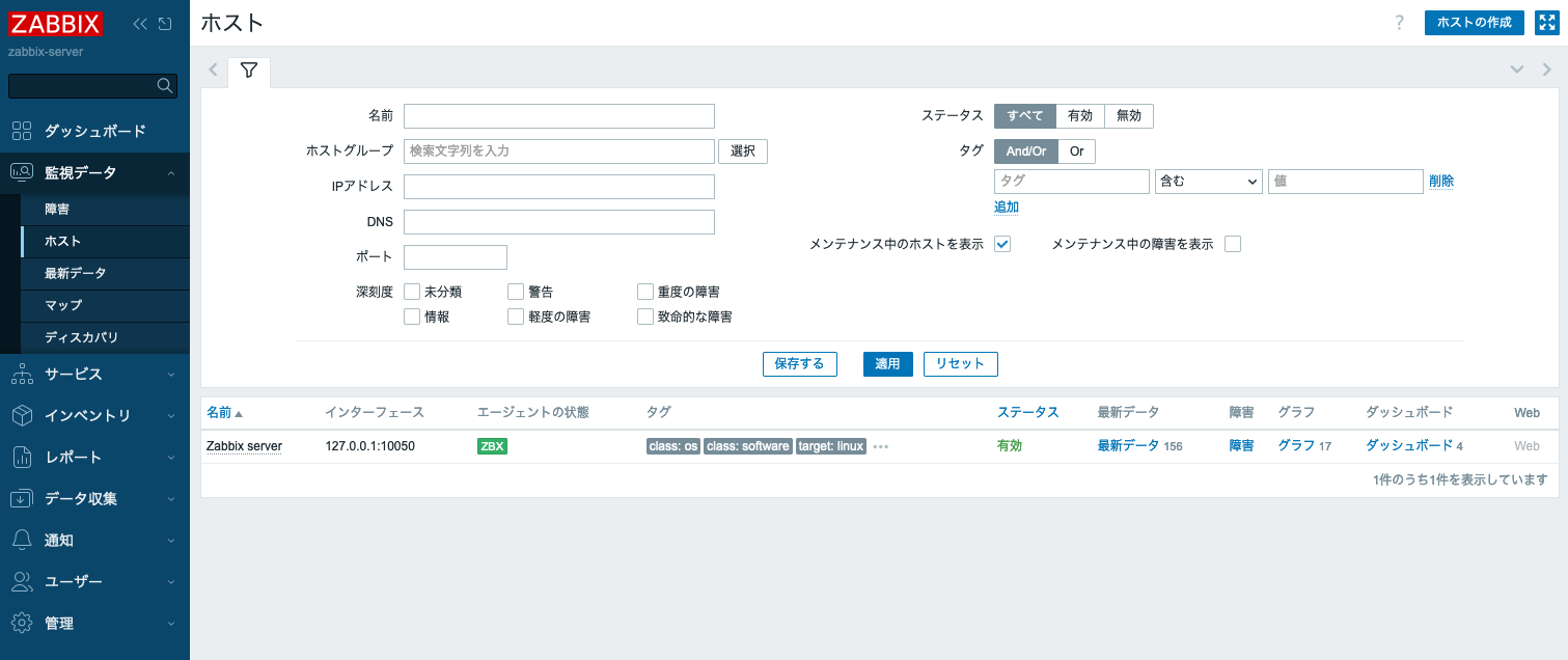 「監視データ」→「ホスト」を見てみましょう。Zabbixサーバー自身が、既に監視されています。グラフやダッシュボードなどを見て、雰囲気を掴んでみましょう。