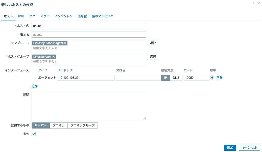「インターフェイス」は、ホストの情報を収集するためのインターフェイスです。今回はZabbixエージェントを利用するため「エージェント」を選択し、監視対象サーバーのプライベートIPを指定しました。