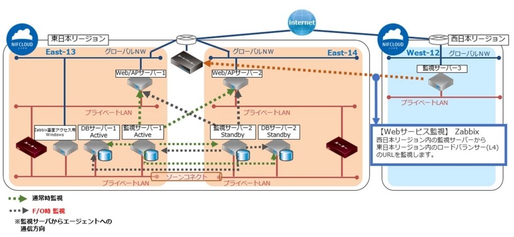 上記構成をとったとしても、FJcloud-V(旧ニフクラ)のゾーン自体に障害が発生した際には対応できません。 FJcloud-V(旧ニフクラ)では複数のゾーンを提供しているため、複数のゾーンを利用して、システムを冗長化することも可能です。また、システムを冗長構成としても、障害中、正常に監視できていないと不測の事態が発生した場合に対応が難しくなります。 そのため、今回は監視にも焦点をあて、監視システム含めてゾーン間で冗長構成としたシステムを構築し障害時の検知/切替などをテストしてみました。 ※今回の検証ではOS以上のレイヤーについても触れていますが、FJcloud-V(旧ニフクラ)ではOS以上は利用者責任で実装する範囲となります。実際に実装を検討される場合は、慎重な検討/検証、入念な設計等をお願いします。
