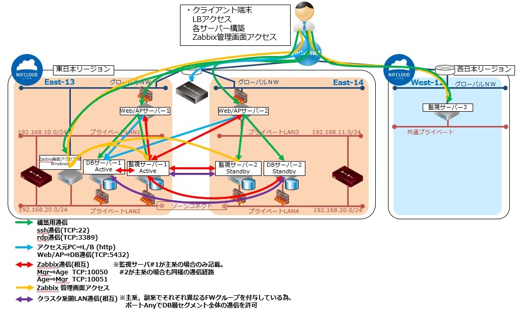 FJcloud-V(旧ニフクラ)ではデータセンター(リージョン)内に複数のゾーンを提供しています。そのため、複数のゾーンを利用して、システムを冗長化することも可能です。 今回は、一般的なWEBシステムを想定してゾーン間で冗長構成とし、ゾーン間を相互に監視できるような構成を考えて、検証してみました。最終的には以下のような構成を構築して検証しています。