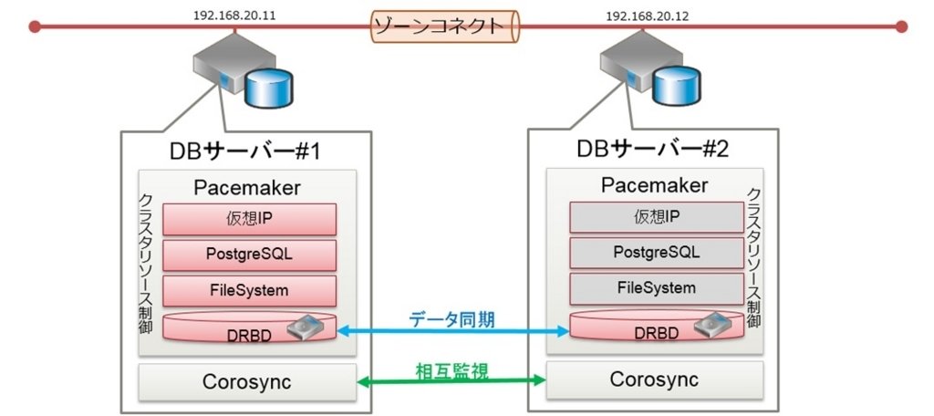 | 制御対象 | Filesystem / 仮想IP / DRBD / PostgreSQL |