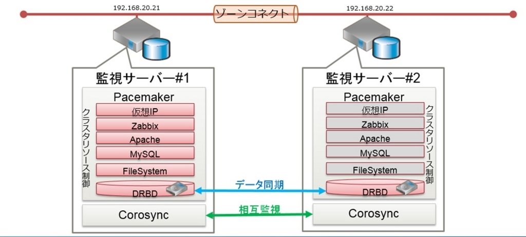 | 制御対象 | Filesystem / 仮想IP / DRBD / Zabbix / Apache / MySQL |