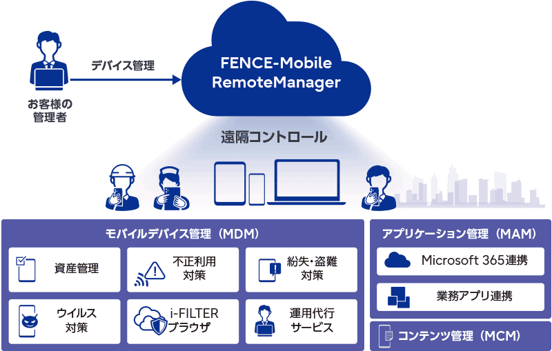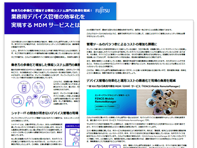 Fujitsu セキュリティソリューション FENCE-Mobile RemoteManagerは、スマートフォン、タブレット、パソコンなどモバイルデバイスの資産管理やセキュリティ対策を実現し、企業の働き方改革やクラウドサービスの利用を支援するエンタープライズモビリティ管理サービス(MDM)です。